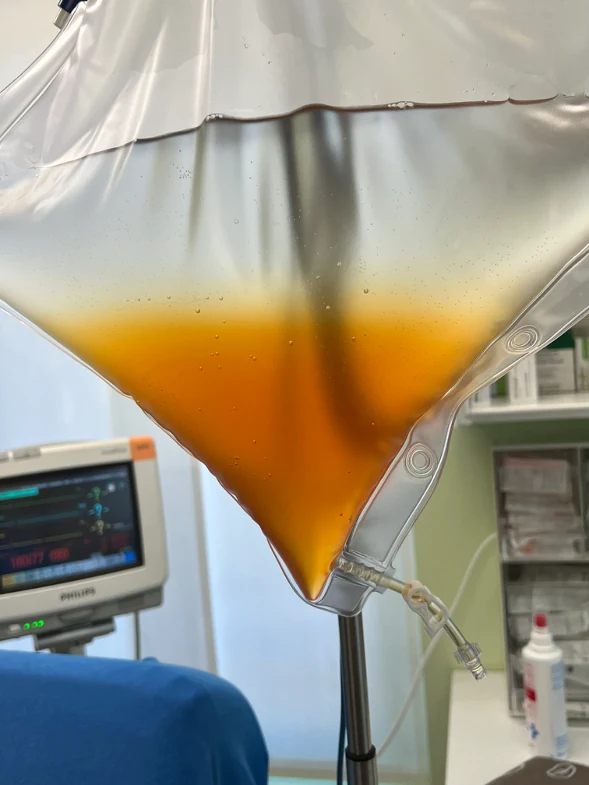 Die hier gezeigte Flüssigkeit stellt Spüllösungen (Kochsalz-Lösungen) dar, die ausschliesslich dazu dienen, schädliche Substanzen aus dem Filter zu spülen, nachdem das Blutplasma mehrmals durch das Filtersystem geleitet wurde. Die Färbung entsteht durch diese spezifischen Stoffe!